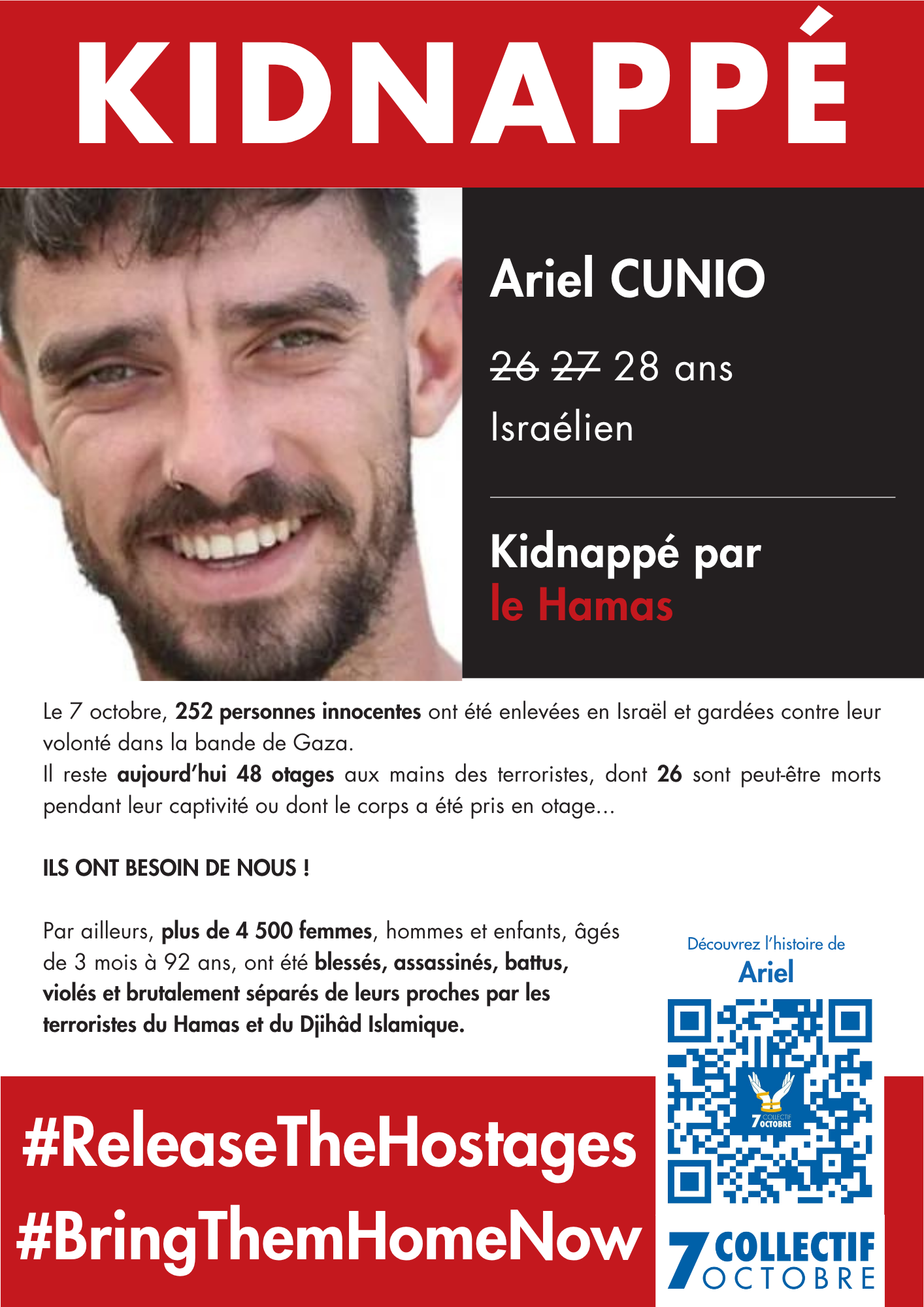 Le 7 Octobre 2023, alors que nous rentrons avec Arbel d’un voyage, des terroristes du Hamas infiltrent notre kibboutz. J’ai le temps d’envoyer un message à ma famille “ Nous sommes dans un film d’horreur “ avant que les terroristes tuent notre chien Merft et nous kidnappent, Arbel et moi mais aussi mon frère David, sa femme Sharon et leurs jumelles de 3 ans pour nous emmener à Gaza en otages. Ma famille et celle d’Arbel sont frappées de plein fouet par cette attaque.