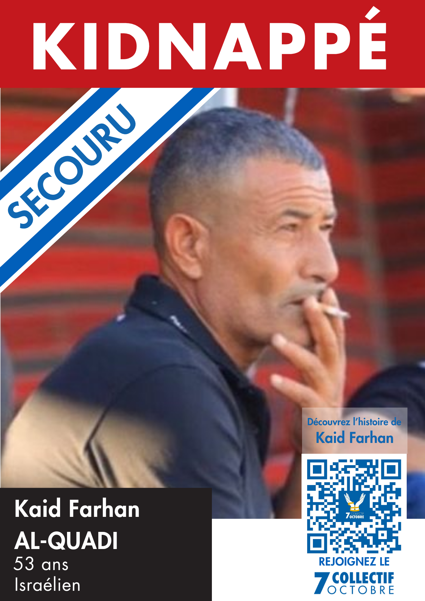 Kaid Farhan AL QUADI, un homme de 53 ans, père de onze enfants, a été brutalement arraché à son quotidien paisible. Le matin de samedi, le 7 octobre, comme tant d’autres, il se rendait à son travail, gardien d’entrepôt à Tzohar. C’était un homme simple, un bédouin israélien qui avait construit une vie stable pour ses deux femmes et leurs enfants à Magen, dans le sud de Rahat, dans la région majoritairement arabe d’al Qasoum.
