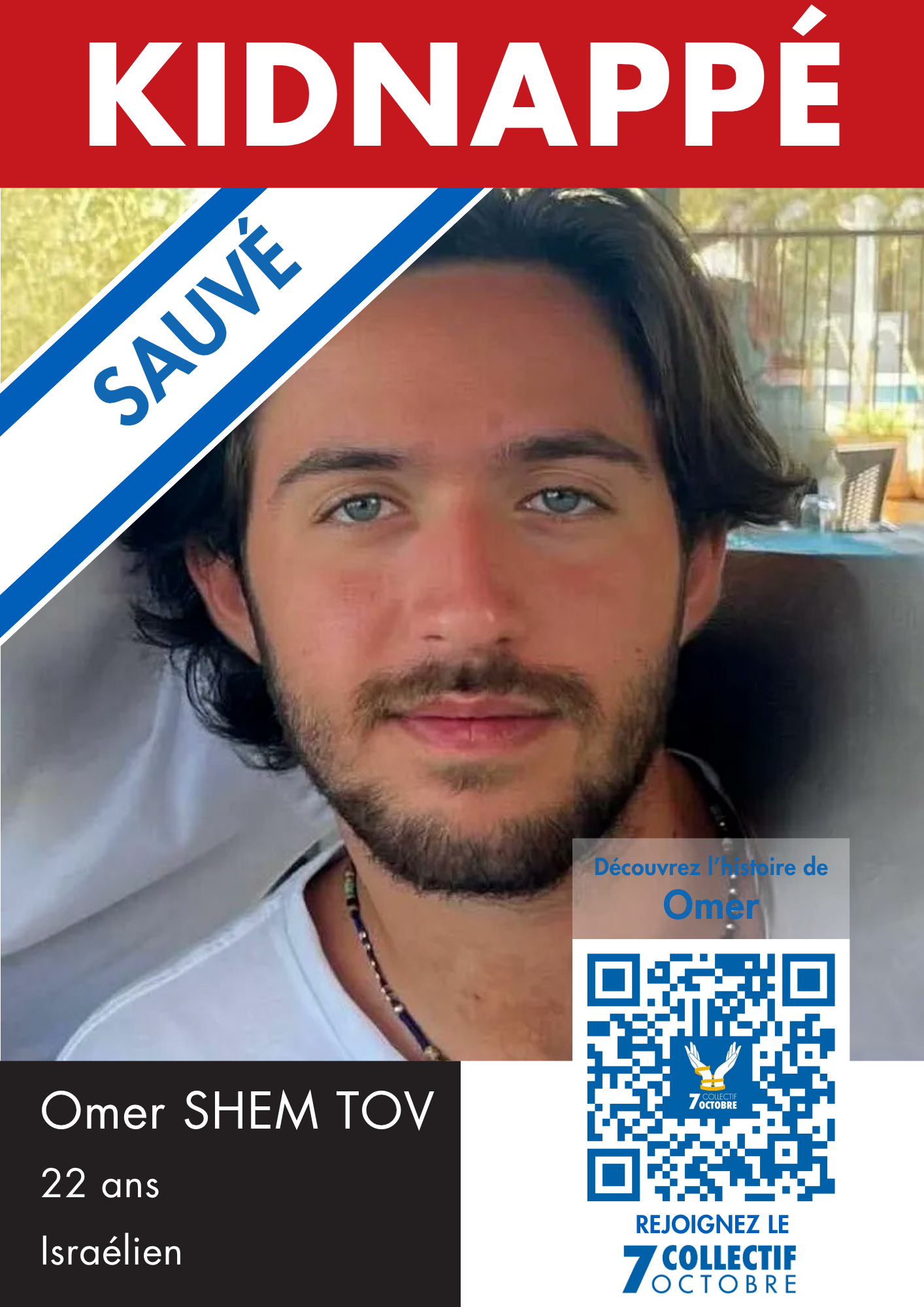 Le 7 octobre, je suis au festival Nova avec des amis quand les terroristes envahissent la fête et abattent des gens partout devant moi. J’ai mes parents au téléphone pendant que je réussis à me cacher. A 9h30 j’atteins avec un ami mon véhicule, je suis totalement paniqué. A 10h c’est la dernière fois que je réussis à joindre mes parents qui verront ma localisation sur mon téléphone se diriger vers Gaza. Quelques heures plus tard, le hamas publie des vidéos de mon ami et moi, captifs, allongés sur le sol. Mes parents reconnaissent mes tatouages.