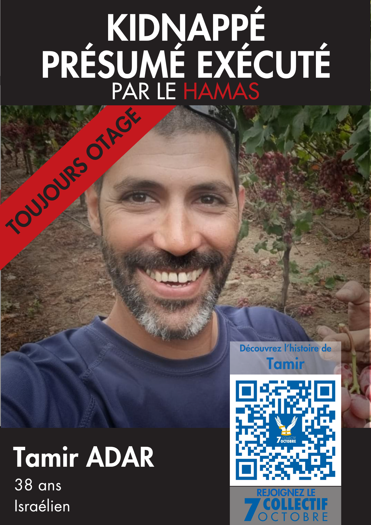 Je m’appelle Tamir Adar, j’ai 38 ans, né et élevé au kibboutz Nir Oz, et troisième génération d’une famille profondément enracinée dans ce lieu que j’aime tant. Je suis le fils de Moshe et Yael, petit fils de Yaffa, et je suis un fervent amateur de sport, supporter passionné du Maccabi Tel Aviv. Marié à Hadas, nous avons deux enfants : Assaf (7 ans) et Neta (3 ans).